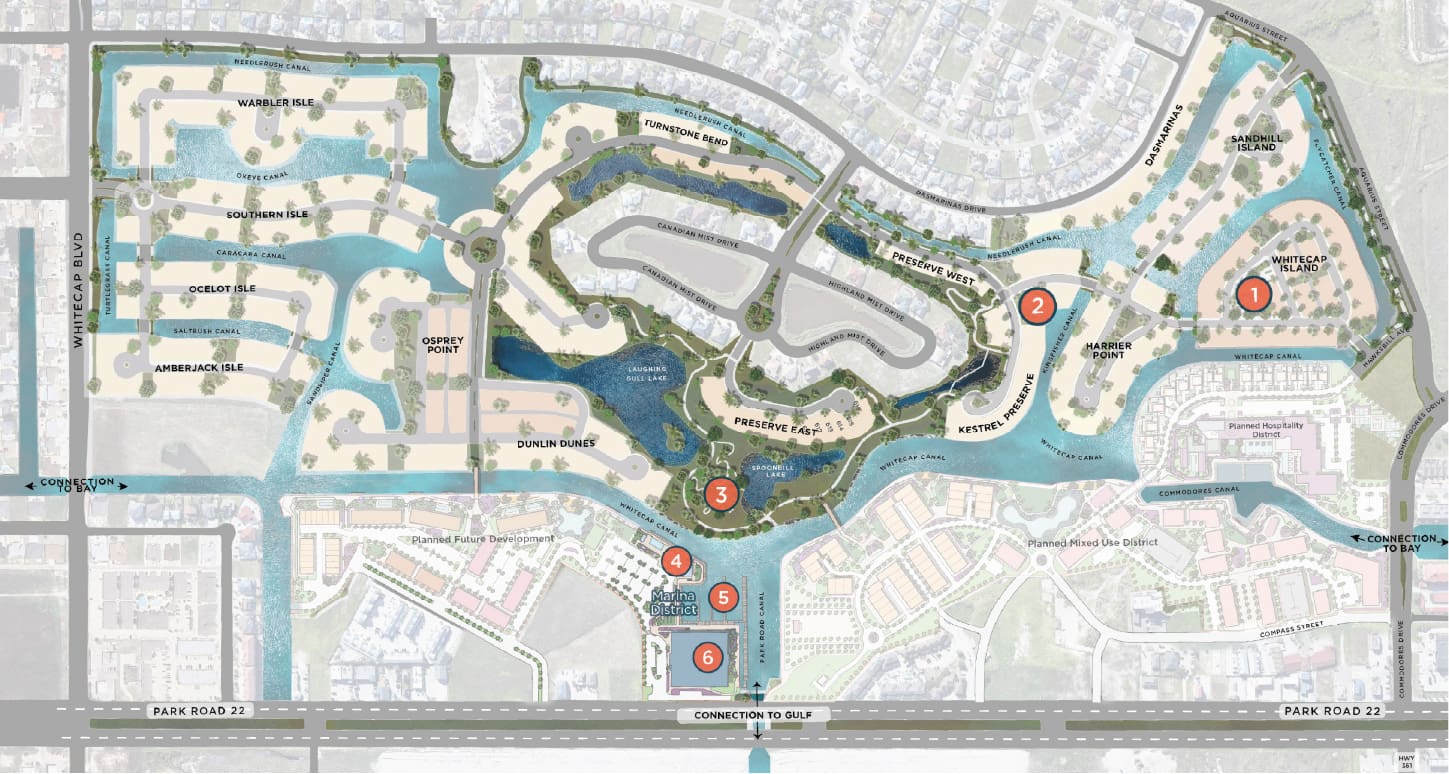 Spanning 240 acres, Whitecap NPI brings together more than 600 planned residences with canals, trails, bridges, and parks. Its amenities include Pelican’s Landing, Heron’s Nest, the Nature Preserve, a future Yacht Club & Marina, and a mixed-use district with shops, dining, and public spaces.