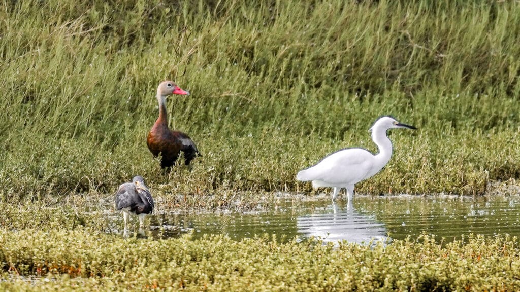 The Preserve’s shallow ponds are a lifeline friend for as many as 380 species. Waterfowl like bufflehead and American wigeon; grebes and pelicans; herons, ibis and cranes; raptors like turkey vultures and merlin; as well as pigeons, wrens, blackbirds, mockingbirds, wood-warblers, and quail.
